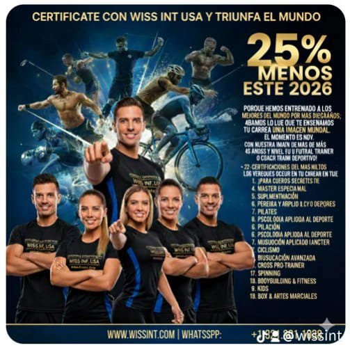 World Institute Of Sports Sciences USA”  es considerada la Institución #1 certificando Entrenadores Personales del más Alto Nivel Educativo alrededor del mundo desde 1980. A nivel mundial  contamos  con miles de graduados, en más de 100 países desde 1985 cuando se comenzaron a ofrecer seminarios en Vivo dictados por el Dr. Marco Ossa y sus asociados.   WISS INT.,  conocida como: “WORLD INSTITUTE OF SPORTS SCIENCES O INSTITUTO MUNDIAL DE CIENCIAS DEL DEPORTE.”Certifica Entrenadores Personales, prepara atletas de elite a nivel mundial y ofrece asesoría a Instituciones públicas y privadas.   Su fundador el Dr. Marco Ossa, creo la División Hispana,  en el Mercado Americano, en el año 1980, siendo así la primera Institución creada  para certificar entrenadores personales y “coaches” de alto nivel educativo, desde los Estados Unidos, para todo el mundo en el idioma español.